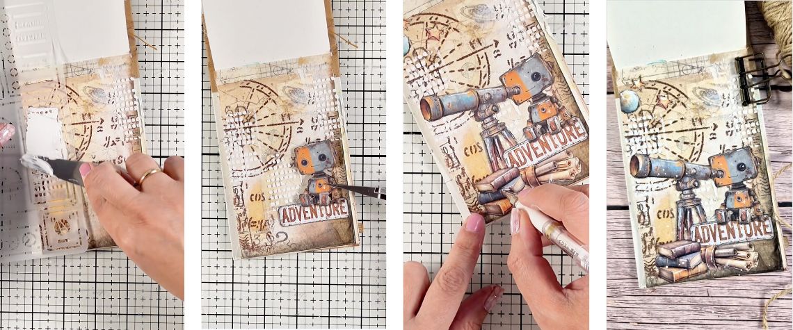 Im Video sieht man, wie sich ein leerer Untergrund nach und nach in eine reich aufgebaute Journalseite verwandelt. Zunächst werden mit Rice Paper Stimmung und Basis geschaffen, danach sorgen eine dicke Schablone und Paste für Struktur. Glitter-Akzente und dekorative Elemente verleihen dem Ganzen anschließend zusätzliche Tiefe und Charakter