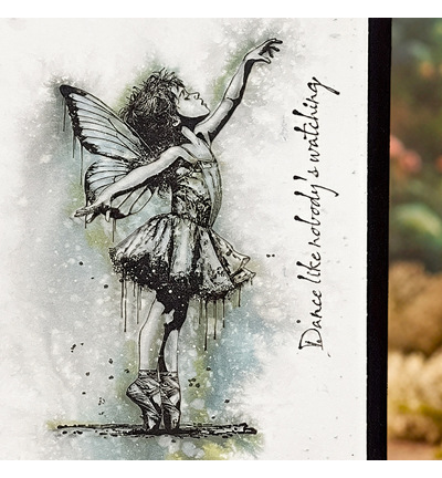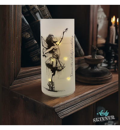 Het ontwerp toont een jong meisje dat sierlijk op spitzen staat in een balletrokje, terwijl haar fijne vlindervleugels een gevoel van lichtheid en fantasie toevoegen aan het beeld. De scène combineert elegantie met Andy Skinner’s kenmerkende licht grungy en artistiek getextureerde stijl, waardoor het ontwerp zowel verfijning als karakter uitstraalt. De set bevat ook de handgeschreven tekst “Dance like nobody’s watching.”