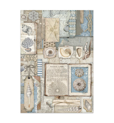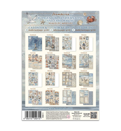 Dit junk journal uit de Silent Sea-collectie bevat 16 pagina's voor art journaling en card making: 8 dubbelzijdige cardstockvellen (220 gr), 4 stickerbladen (120 gr) en 4 dubbelzijdige cut-outvellen (220 gr). De rustige zeemotieven in blauw en turquoise — golven, schelpen, kwallen en zeesterren — zijn op alle materialen doorgevoerd.