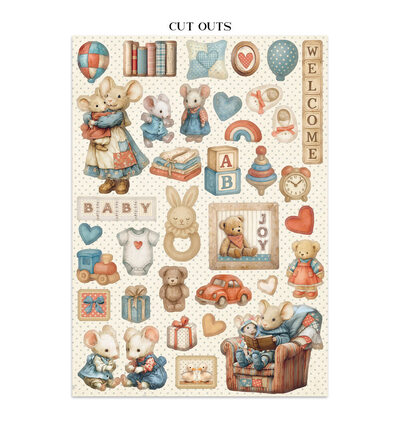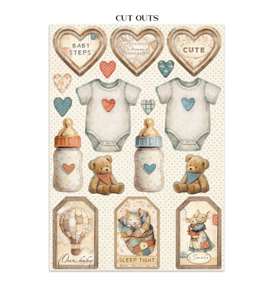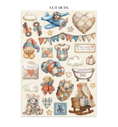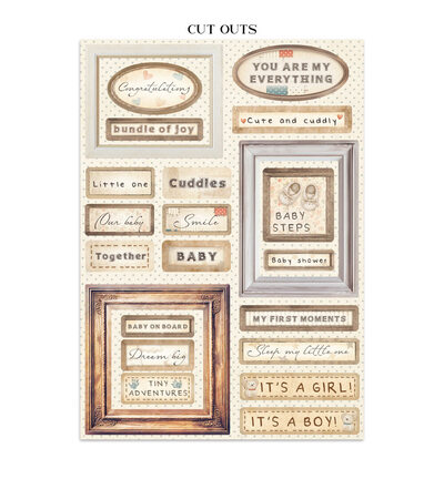 Gebruik de cardstockvellen als albumachtergrond, de stickers voor titelbladen en omslagen, en de cut-outs als losse accenten op babyfotoalbums en het eerste-jaarboek. Combineer het pakket met bijpassende rub-ons of ephemera voor een teder herinneringsalbum. Handig voor ouders en grootouders die de eerste momenten willen vastleggen in een handgemaakt dagboek of fotoalbum.