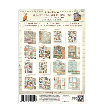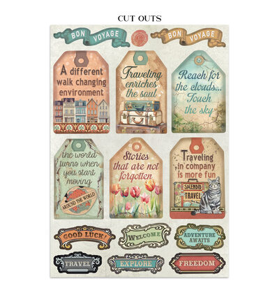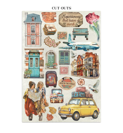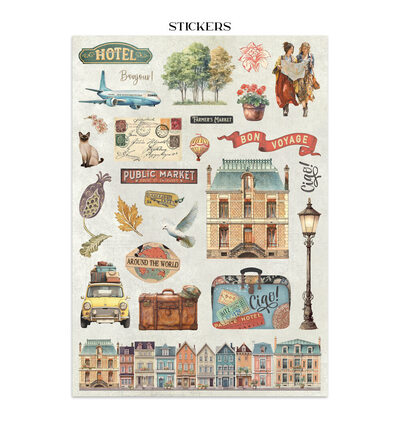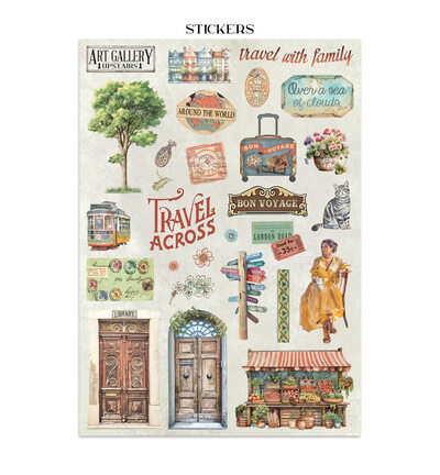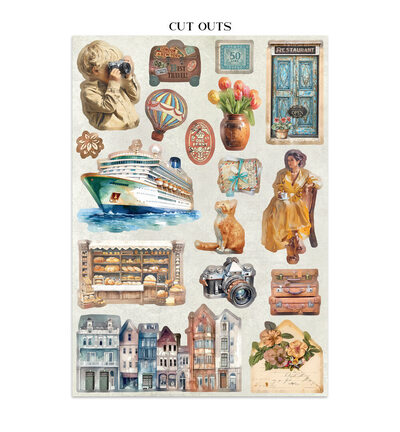 Dit junk journal pakket uit de Art of Travelling-collectie bevat een gevarieerde selectie decoratieve elementen op zuurvrij papier, waaronder achtergrondvellen, stickers, tags en cut-outs met een reisthema. De sfeer van avontuur, ontdekking en het bijhouden van herinneringen staat centraal in de ontwerpen, die ideaal zijn voor het samenstellen van een reisgeïnspireerd junk journal.