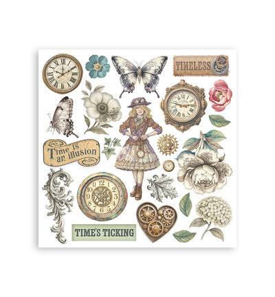 Dit rub-on kit uit de Gardens of Time-collectie laat u decoratieve details snel op papier overbrengen. Het bevat zes vellen met overdraagbare motieven. De sfeer van Gardens of Time mengt klokken, tandwielen, rozen, patina en vlinders met vintage, gelaagde texturen.