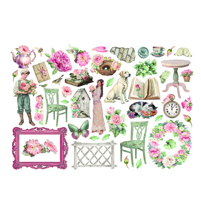 Deze decoratieve ephemera uit de House of Roses-collectie bevat zelfklevende of losse decoratieve elementen voor gelaagde composities. De sfeer van House of Roses ademt romantische tuin, zachte vintage elegantie, rozen, hekwerken, vogels en botanische ornamenten.